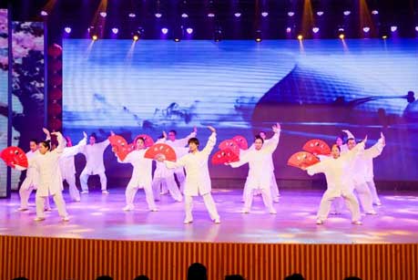 院领导班子成员集体向大家拜年,向观众抛洒吉祥物,整个会场气氛热烈祥和。