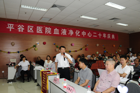 2014年9月7日上午,平谷区医院血透室隆重召开了血液净化中心成立20年大庆暨第六届肾友联谊会。会议邀请了中华肾脏病学学会常委、首都医科大学肾病系主任刘文虎教授,协和医院大内科副主任李航教授,协和医院肾内科蔡建芳教授及创办血液净化中心老院长陈勤昌院长。我院院长出席并致辞。近百名患者及家属参加了此次联谊会。
