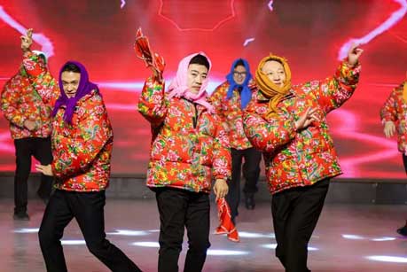 院领导班子成员集体向大家拜年,向观众抛洒吉祥物,整个会场气氛热烈祥和。