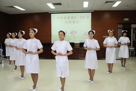 随后在护士礼仪展示中,美丽的“天使”踏着轻盈的脚步向我们走来。一个微笑、一声问候、一次鼓励、一个鞠躬、一声道别,都是架起护患沟通的桥梁,都能抚慰那些受伤的心灵。从她们的坐、立、行、走到下蹲拾物,一招一式都一丝不苟、有条不紊、规范得体、从容应对。通过现场护士仪容、服饰、体态(站姿、坐姿、走姿)、语言等礼仪示范,展现出了护士良好的职业形象。