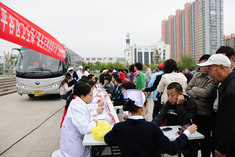 图为平谷区医院参加由平谷区卫生局组织的“服务百姓健康行动”义诊活动现场。活动主要针对常见病、慢性病咨询和义诊,宣讲健康知识,倡导健康生活方式,免费检测血糖、血压。