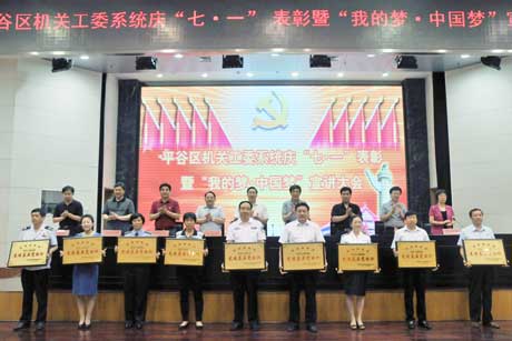 2013年6月21日,我院在平谷区机关工委系统庆“七•一”表彰暨“我的梦•中国梦”宣讲大会上,荣获“先进基层党组织”荣誉称号。图左(六)为我院党委书记张宝军上台领奖。